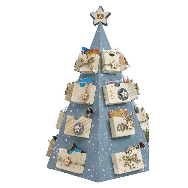 Confezione da 2 fogli di cartone vegetale pretagliato (da piegare ed incollare) per realizzare un Calendario dell’Avvento a forma di Albero di Natale con piccole taschine contenitori in 4 dimensioni differenti.
