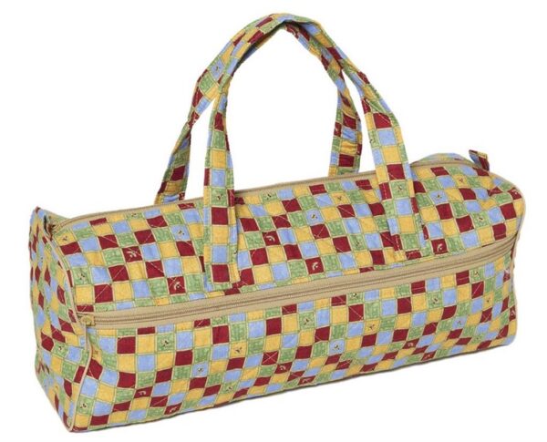 Borsa portalavoro a quadri rossi/arancio, 2 maniglie e una tasca laterale.