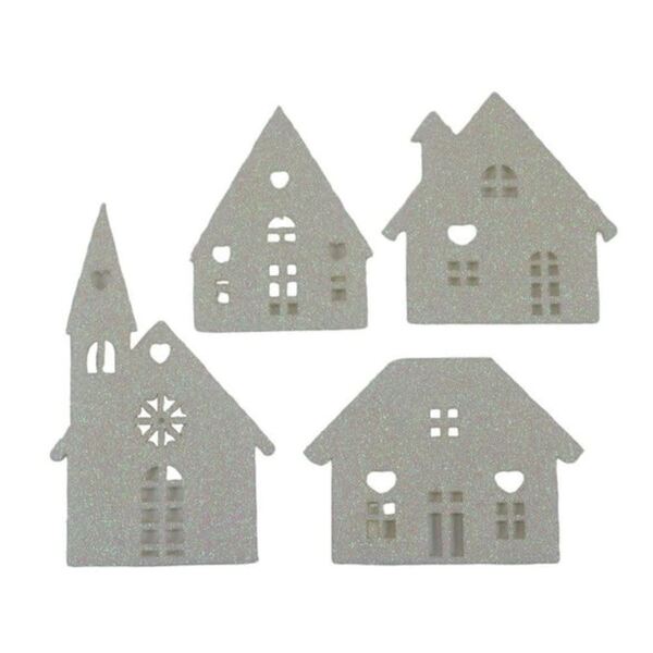 Foglio di feltro fustellato con casette color bianco iridescente glitterate, di varie forme e dimensioni.