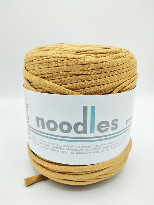 Le fettucce Noodles sono filati ricavati da scarti di tessuti non usati dell’industria tessile e di moda per cui, essendo materiale residuo, ogni gomitolo potrebbe avere sfumature di colore differente.