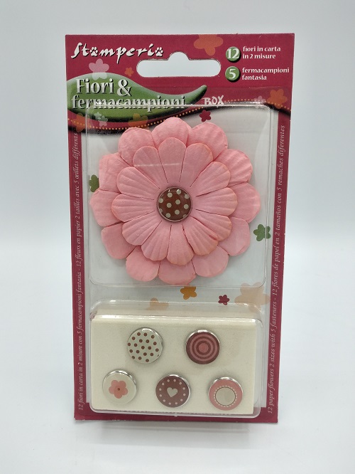 Confezione 12 fiori di carta rosa con 5 fermacampioni in fantasie assortite.