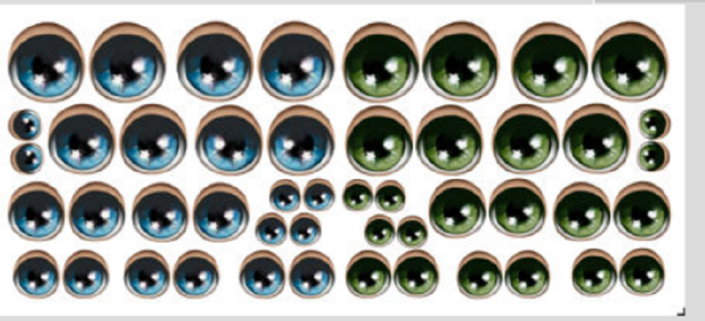 Foglio con 24 coppie di occhi di due colori (azzurro e verde) e cinque dimensioni stampati su Fommy by Renkalik.