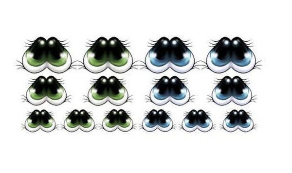 Foglio con 14 coppie di occhi di due colori (azzurro e verde) e tre dimensioni stampati su Fommy by Renkalik.