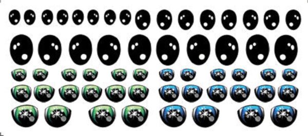 Foglio con 29 coppie di occhi di tre colori (azzurro, verde e nero) e cinque dimensioni stampati su Fommy by Renkalik.