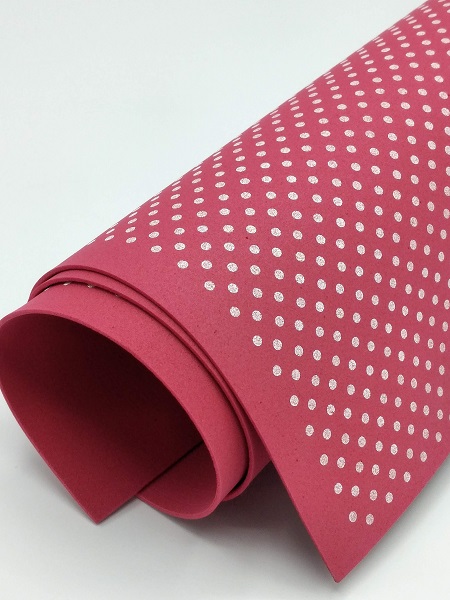 Foglio 40x60cm di moosgummi colore rosso con pois bianchi spesso 2 mm.