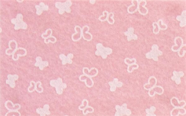 Foglio di pannolenci 100% poliestere di colore Rosa pastello con piccole farfalle bianche stampate solo su un lato.