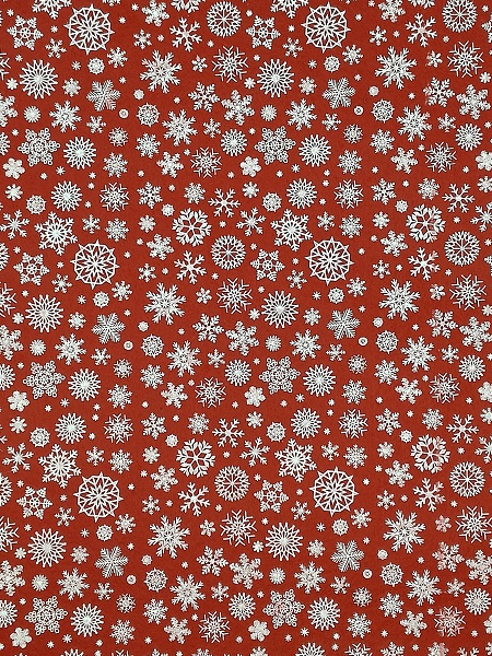 Panno colore rosso con fiocchi di neve in varie forme e dimensioni di colore bianco.