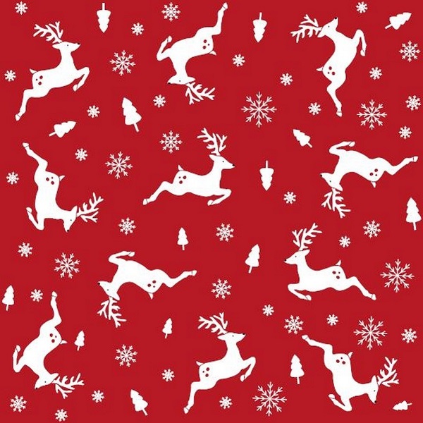Panno colore rosso con cervi, alberi di Natale, fiocchi di neve.