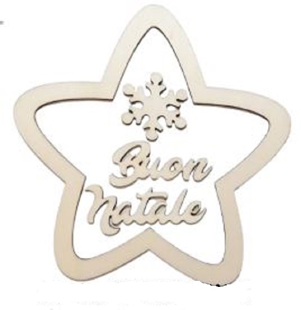 Sagoma in legno a forma di stella con scritta Buon Natale e fiocco di neve.