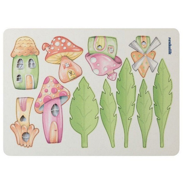 Confezione da 11 sagome in cartone vegetale, pretagliato e colorato, a forma di casette funghetto e foglie by Renkalik.