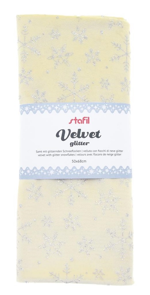 Tessuto velluto bianco latte con fiocchi di neve glitter argentati in rilievo.