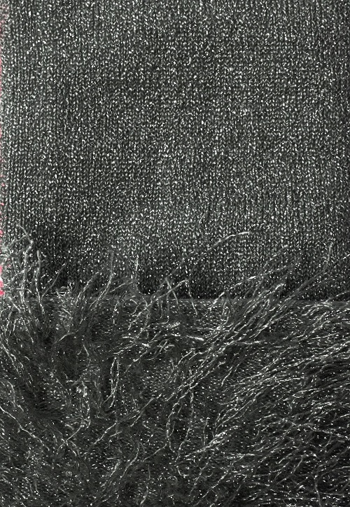Questo particolare tubolare è double face, da un lato presenta tanti fili di cotone e lurex che creano un effetto peluche mentre nell’altro lato la maglia è rasata colore oro e lurex oro.
